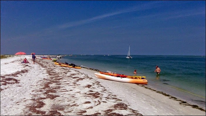 Caladesi Island has a kayak trail which winds through the mangroves surrounding the east side of the island. As you can see below, this was like paddling through a mangrove tunnel. It did get very narrow in parts and we had some people ahead of us there were going verrrrrry slow. But we eventually made it back to open water. We were thinking that we had done the whole trail, but later finding a map on-line we realized that we only did a short section of the trail. I guess we’ll have to make another trip here to do the entire length of the trail.